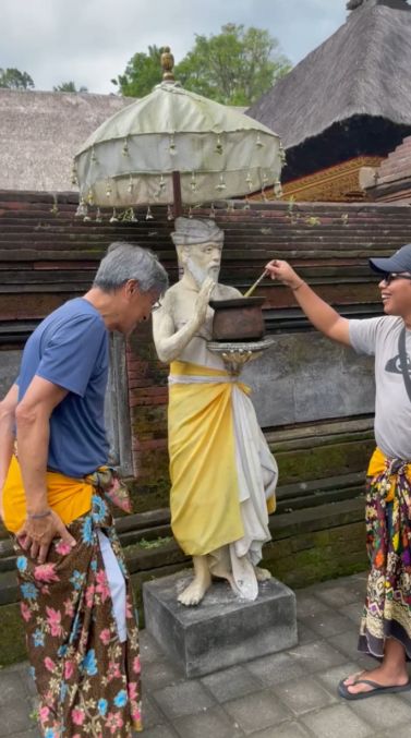 Our tour guide giving Hoa's blessing with the holy water directly from the sacred spring or the purification pool itself. The statue of the man holding a pot (or vessel) of holy water is a representation of a deity or a spiritual figure associated with the spring's sacred power, often protecting or symbolizing the source of the holy water. Receiving the blessing is the final, essential step after the purification ritual. The water is usually sprinkled over the head and often pressed onto the forehead and behind the ears, symbolizing a spiritual cleansing and receiving good fortune for your onward journey.