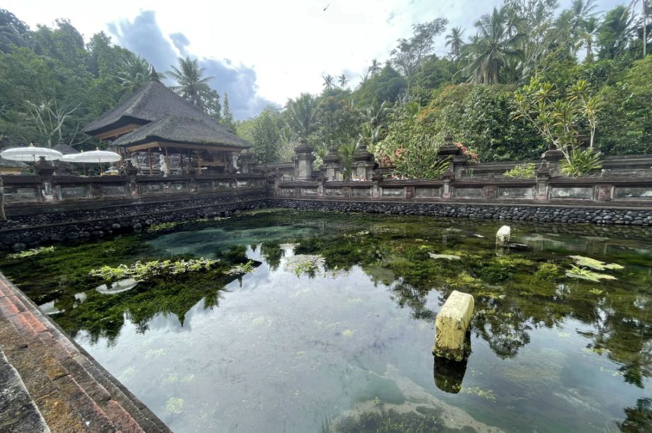 This pond is incredibly important because it is the source of the Holy Water and is flowing into the purification pools we saw earlier. The water comes straight from the underground spring and is crystal clear. Plants (like green algae and water grass) grow beautifully beneath.