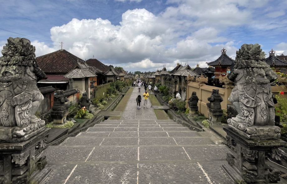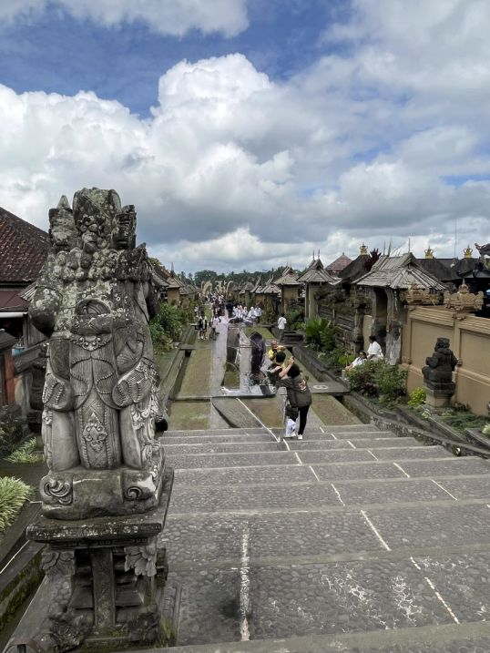The two huge guardian statues at the top of the stairs mark the transition from the lively communal area of the village to a more sacred and restricted zone. These guardians are meant to protect the boundary between the world of the living and the world of the ancestors, a concept that is deeply rooted in Balinese Hindu cosmology.