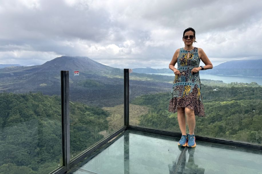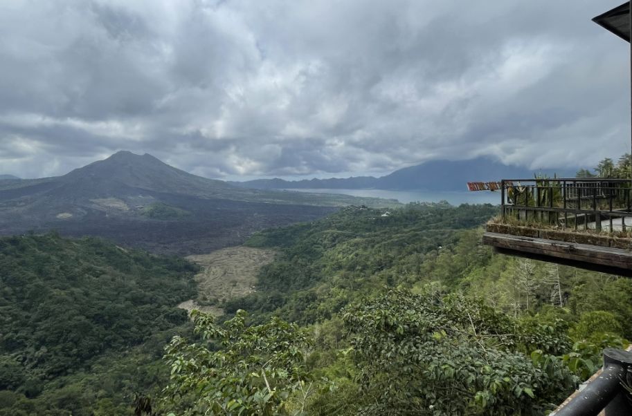 I am standing on one of the balcony and the panorama is incredible with Mount Batur rising sharply in the distance, its dark volcanic slopes stretching across the horizon.