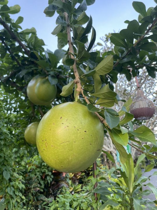A Calabash tree at the resort. These trees are common in tropical Bali, and the fruits are large, round or oval, hanging directly from the trunk or branches. The shell Is the valuable Part is the main reason the fruit is grown. It’s used to make bowls, cups, ladles, and decorative containers.