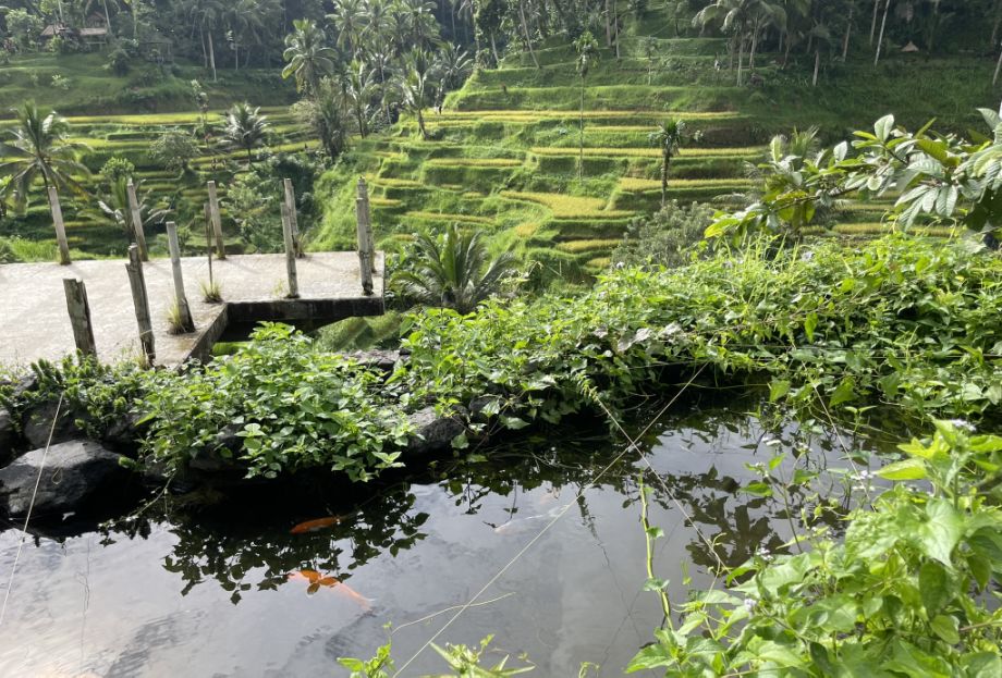 We came across a small pond where large koi drifted slowly beneath the surface. Their bright oranges, whites, and gold shimmered in the water, creating a peaceful moment tucked between the terraces, like a little oasis amid the stepped fields.