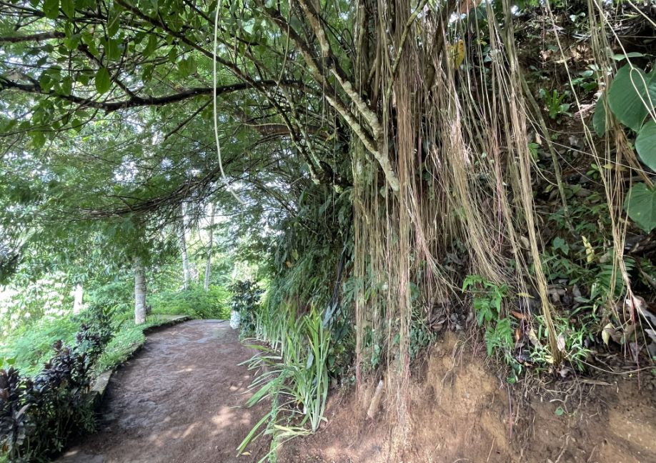 Walking deeper, the trail narrowed into a dirt pathway shaded by tall trees. These trees had long, hanging strands, like natural strings or aerial roots dangling from their branches. The way they swayed lightly in the breeze made the path feel almost enchanted, a quiet transition from the open terraces into a more forested, serene pocket of the landscape.