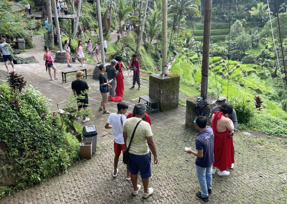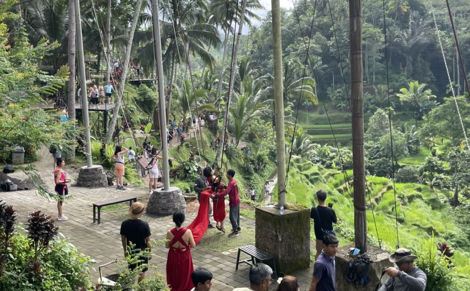 As we stepped into the large open area dedicated to the swings, the atmosphere changed instantly, much livelier, louder, and full of anticipation. Dozens of people were gathered around the platforms, most of them waiting in long lines for their turn to fly out over the rice terraces. There are a lot of excited chatter, cameras clicking, and the occasional cheer from someone taking off on the swing.
