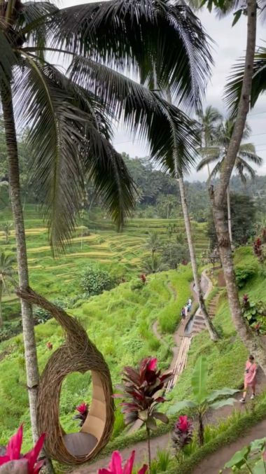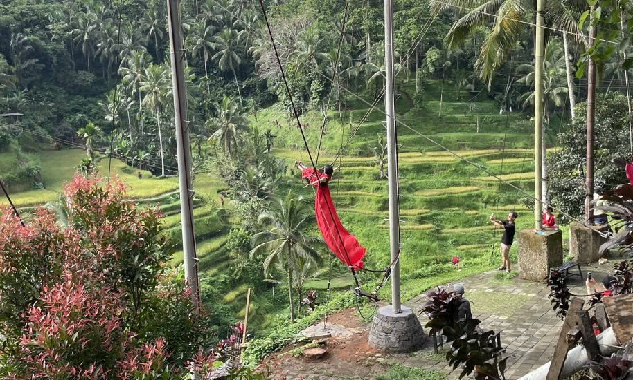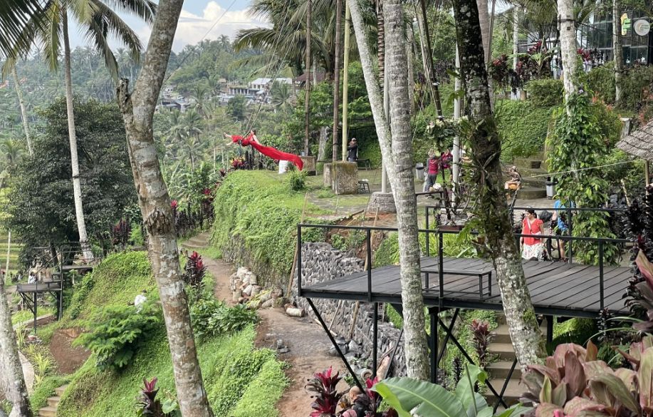 As we stepped into Tegalalang, that sense of commercial energy became obvious almost immediately. Within just a few minutes of walking in, we saw two ladies dressed in bright red and fuchsia soaring through the air on one of the famous “Bali swings.” Their vibrant outfits and the dramatic swinging motion against the backdrop of golden rice terraces made quite a striking scene, but it also highlighted how much this area has transformed into a spot built for photos, souvenirs, and quick thrills.