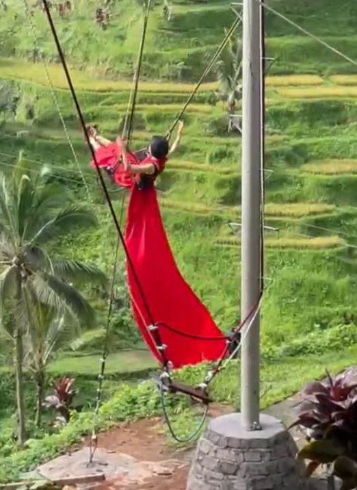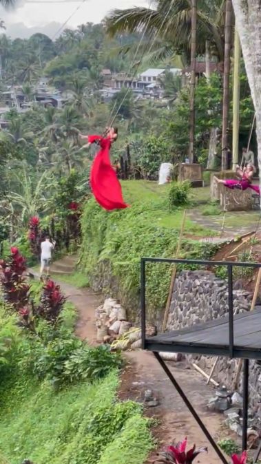 Many of the visitors wore flowing red dresses that billowed dramatically in the air, adding to the spectacle. The bright red fabric stood out sharply against the greens and gold of the terraces, creating those classic “Bali swing” photos everyone recognizes.