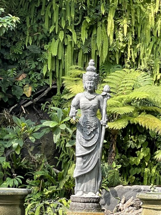 The Lakshmi statue surrounded by a pool represents the goddess of prosperity, abundance, good fortune, and purity in Hindu belief.