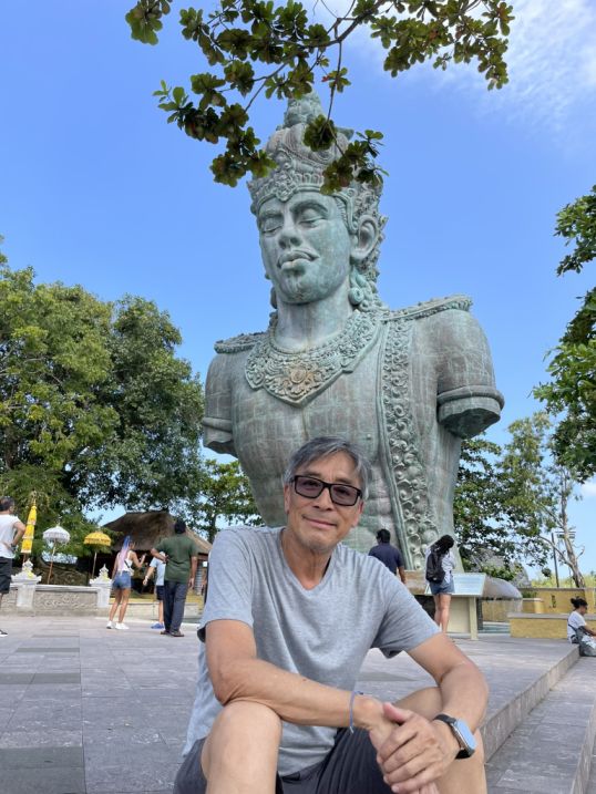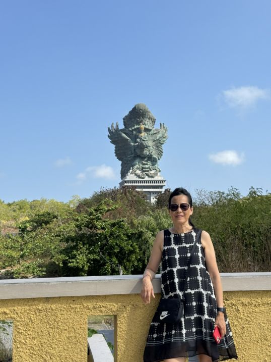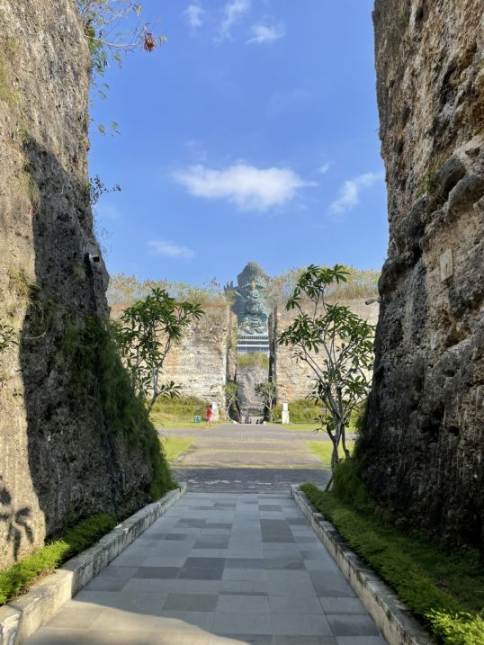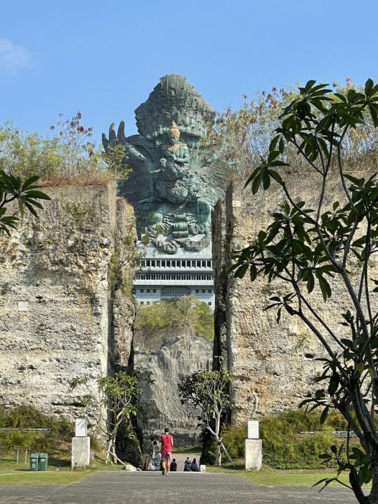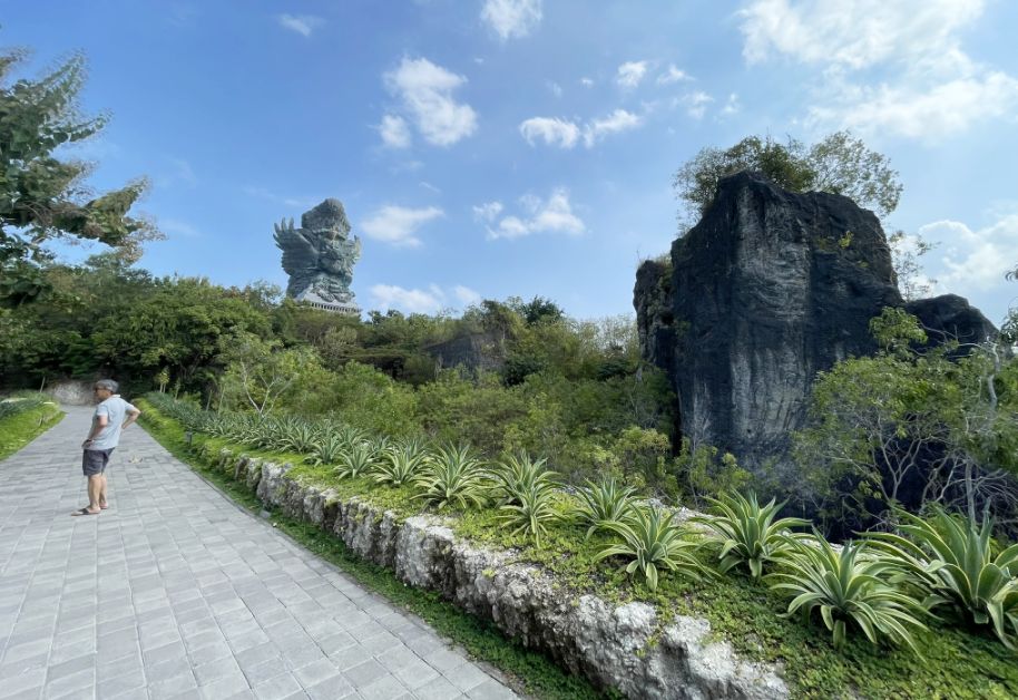 From the balcony near the Vishnu Torso, the view suddenly opens up, and there, rising far above the trees and the limestone cliffs of the park, is the giant Garuda Wisnu Kencana statue, one of the most impressive sights in all of Bali