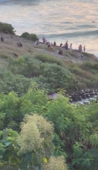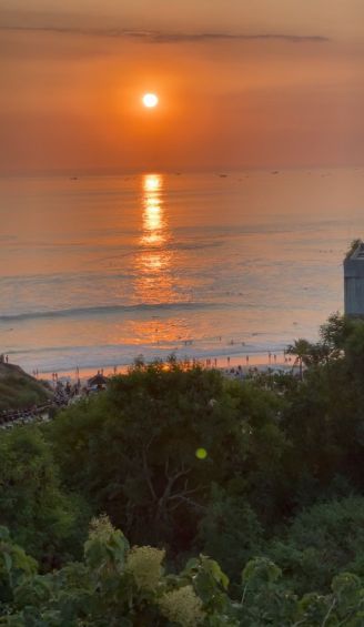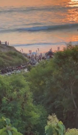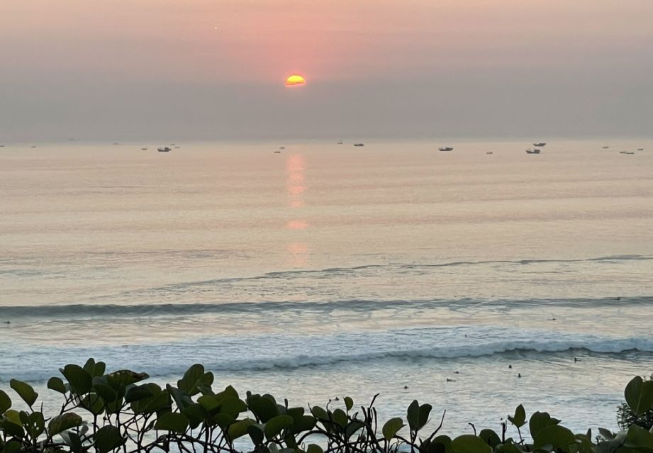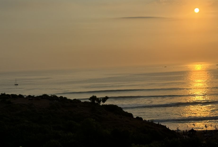 From the rooftop we can see people gathering along Balangan beach, silhouettes of families, surfers, couples, all pausing to watch the sun sink into the water.