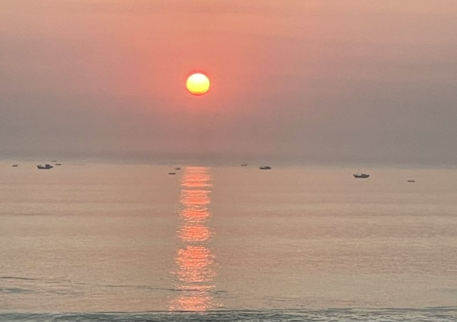 I captured the sunset at the perfect moment where the entire sky is washed in soft gold and light orange, blending together like warm watercolor. On the ocean, the sun creates a long, bright golden ray that stretches across the surface, almost like a glowing path leading to the horizon.