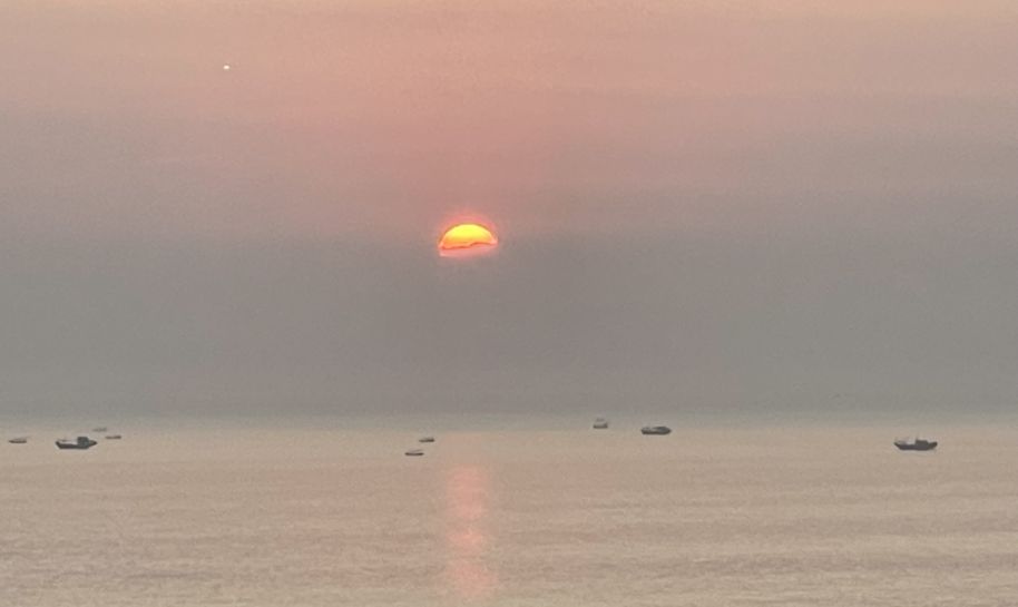 As the sun drops lower, the sky turns a bright orange, soft at the edges, almost like it’s painted across the horizon.