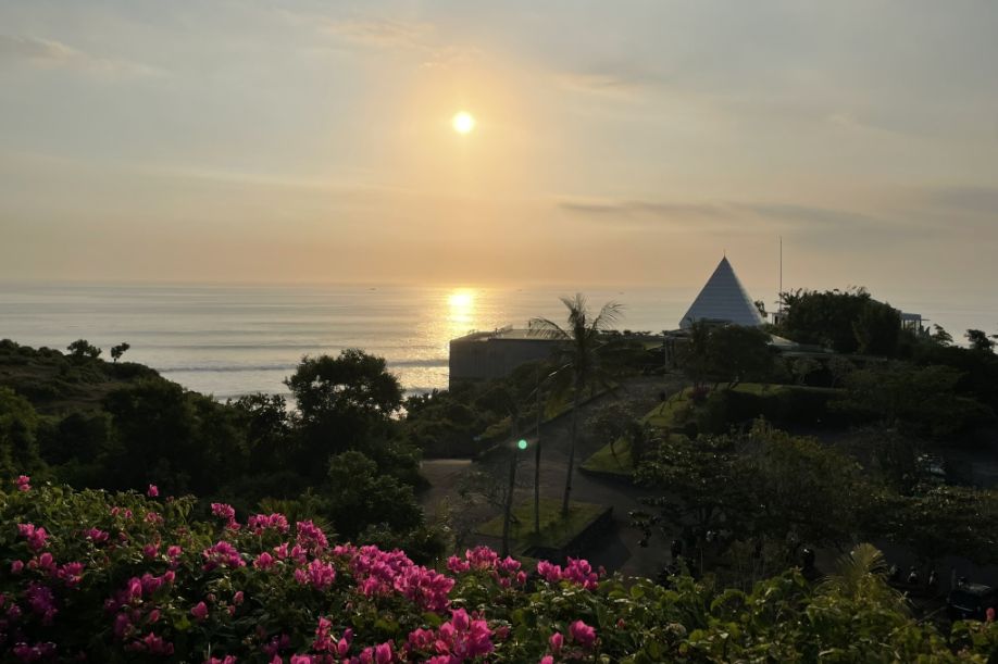 From the rooftop, with the open sky above and the ocean glowing below, the moment feels peaceful, vivid, and very Bali.
