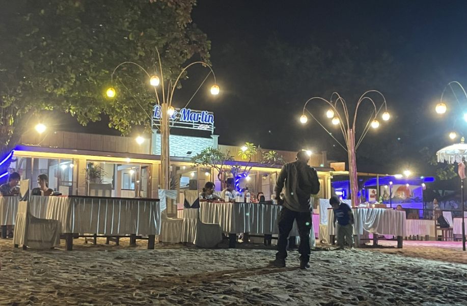 Blue Marlin Café is one of the well-known beachfront seafood restaurants along Jimbaran Bay, an area famous for its long row of dining spots offering fresh seafood grilled over coconut husk fires. It’s a place many tour guides recommend because of its atmosphere and the “dinner on the sand” experience, but we found out that it’s also very much designed for tourists.