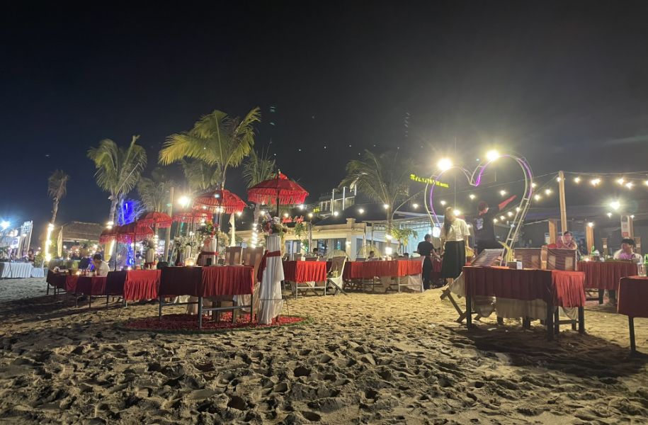 This area is part of the Jimbaran seafood dining strip, where dozens of restaurants set up tables directly on the beach.
