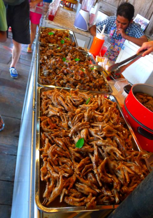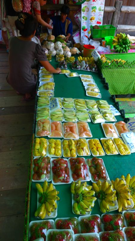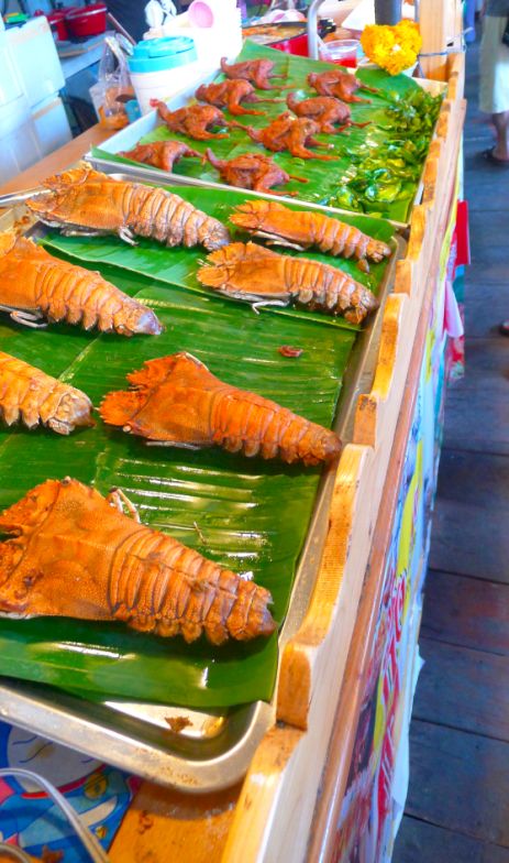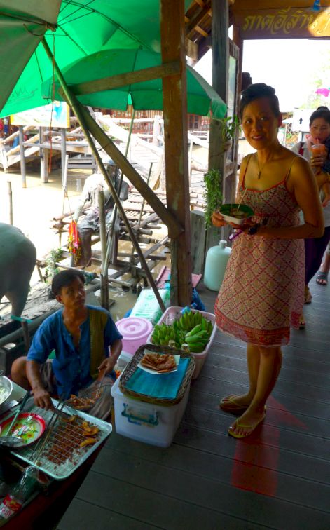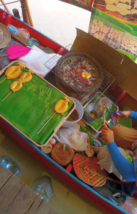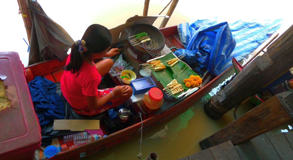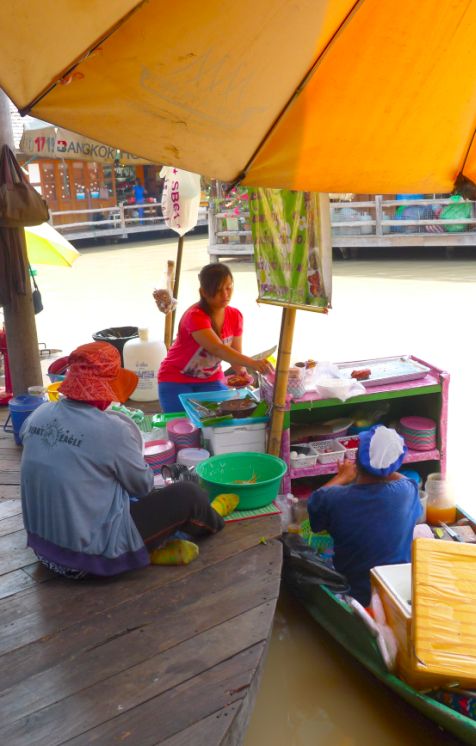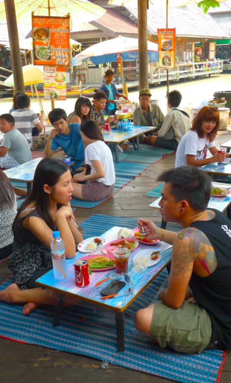 After buying your food from small boat people can sit down and eat their food sitting down on straw mat.