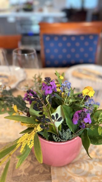 Adding a vibrant touch to the sophisticated setting are the charming floral arrangements. Placed strategically along the table, these bouquets burst with a delightful mix of purple, pink, and yellow blossoms, along with fresh greenery.