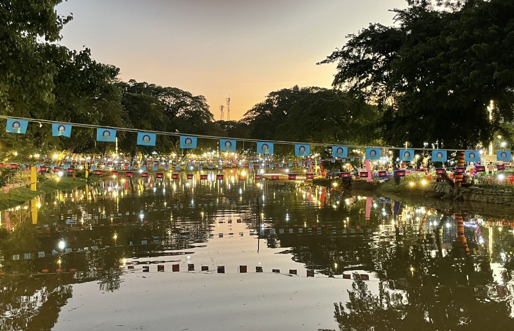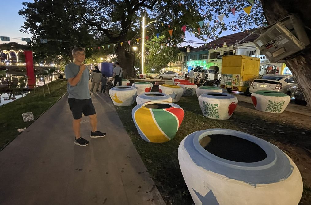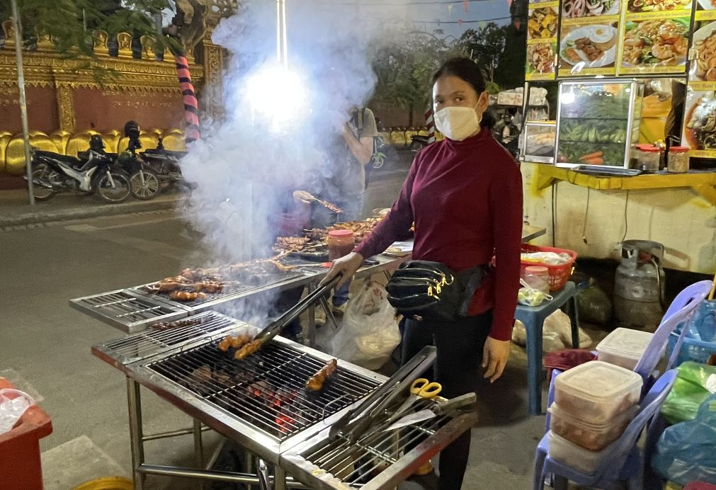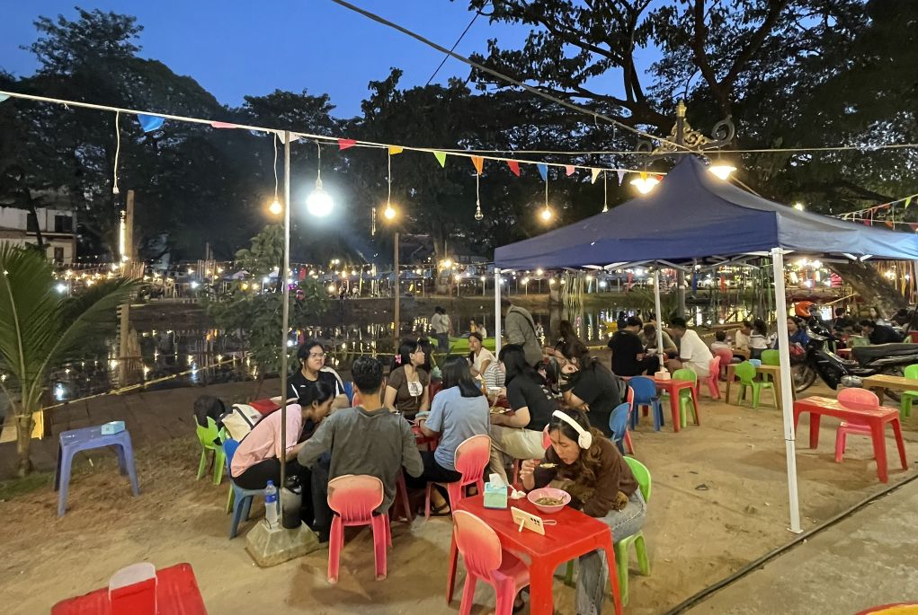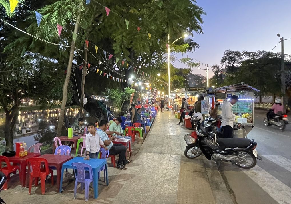 In the early afternoon part of Road 60 starts to fill with vendors pushing their carts and unfolding stands and they set up plastic tables and chairs along the river.