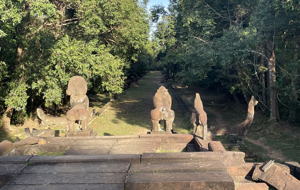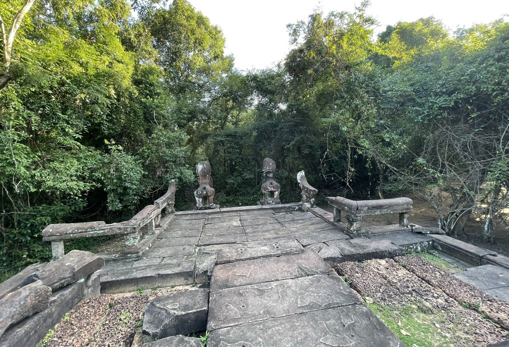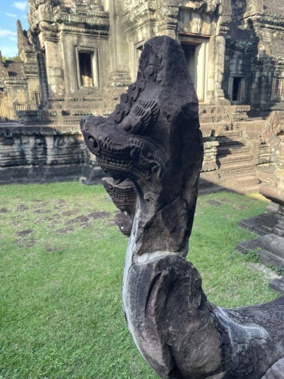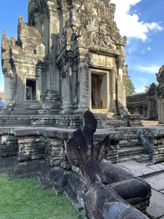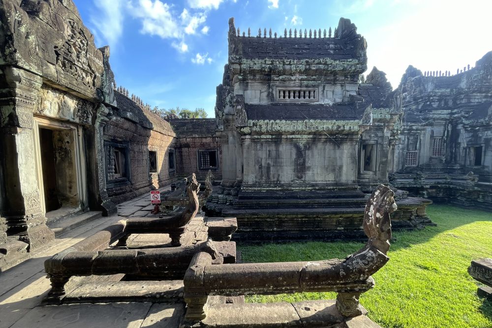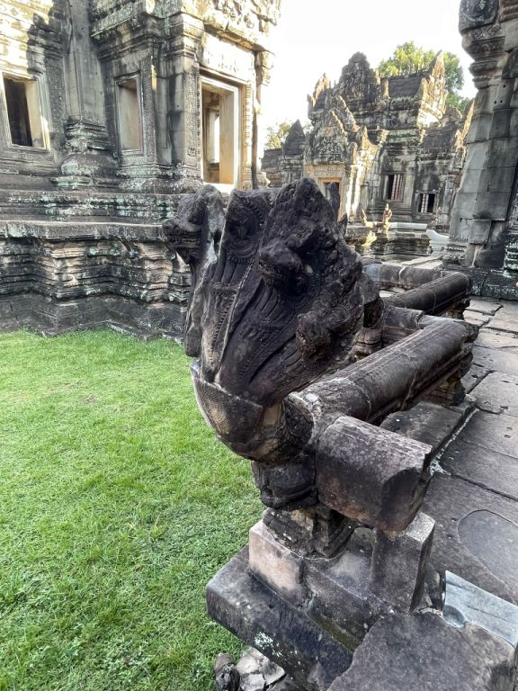 The narrow walkway that runs around the periphery of the first enclosure is line with carved naga balustrades that enhance the beauty of the temple.