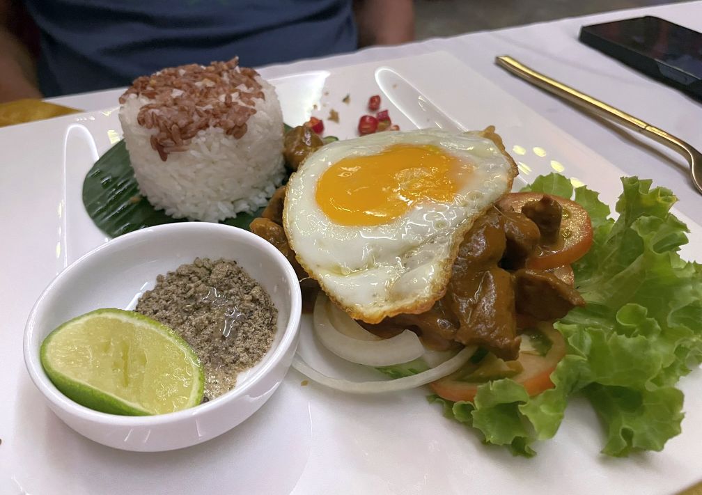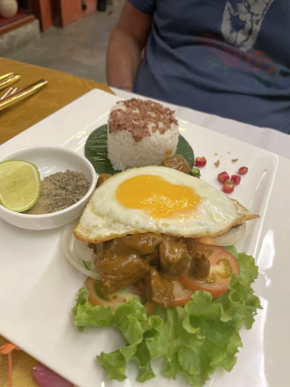 Hoa ordered shaken beef with pan fried egg and served with rice.
