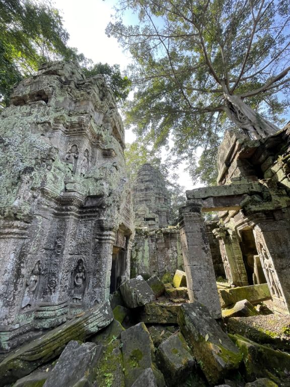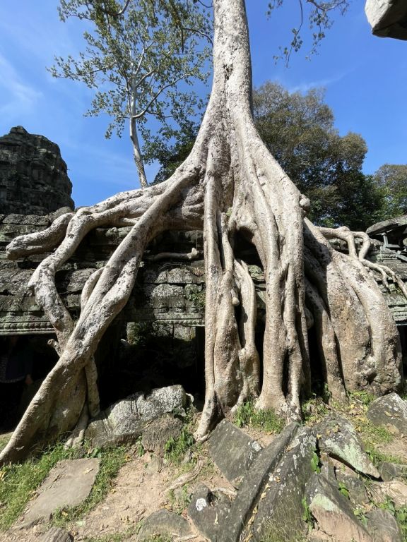 The relationship between the temple's ruins and the jungle, particularly the enormous roots of strangler fig is enveloping the stone structures, creates a surreal and hauntingly beautiful sight.