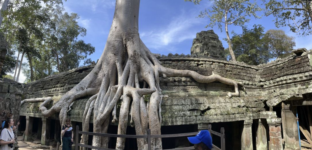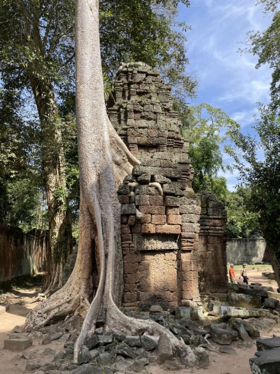 The roots of the tree are blending with the gopura.