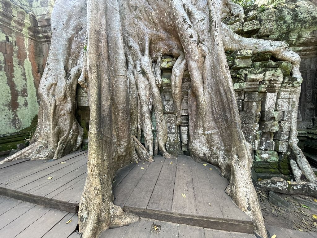 At Ta Prohm, nature has not merely encroached upon man-made structure, it has become an integral part of the architecture itself. The silk-cotton and strangler fig trees have thrust their roots over and through the temple's walls, their growth guided by the stones and bricks laid down centuries ago.