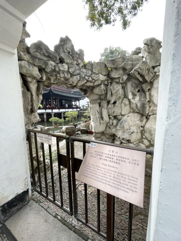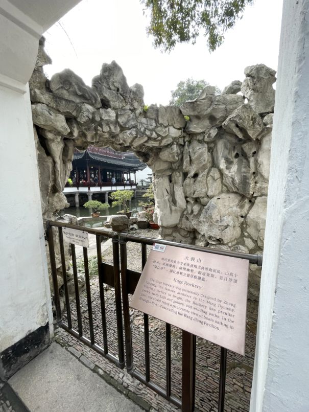 A 39 ft. high formation made of 2,000 tons of rare yellow stones brought all the way from Wukang in Zhejian province. Each rock you see here was fused to the other using a combination of rice glue and limestone to create a formation that essentially evokes a mini landscape of cliffs, winding path an gorges that was designed by Zhang Nanyang, a famous garden artist.
