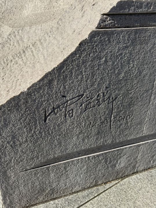 On the left is the signature of Lei Yixin signed the work in Chinese characters (雷宜欣). The "2010" represents the year the carving was completed in China before the 159 massive granite blocks were shipped to the United States and reassembled like a giant 3D puzzle.
