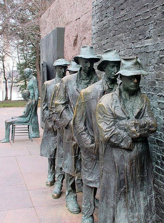 A bit farther on, the story expands. Along the wall, the Depression breadline appears, a sculpted line of figures pressed into the stone. They stand close together, coats heavy, faces worn, bodies angled forward as if time itself is dragging them down. There is no individuality emphasized here; instead, there is repetition, sameness, and quiet patience. This was not one person’s hardship, it was collective.