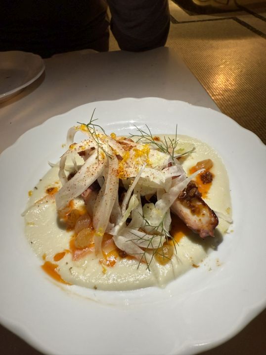 Grilled octopus, when done well, is tender with a slight char that adds smokiness. The fennel contributes freshness and subtle licorice notes. Saucisson basquaise (a Basque-style sausage) introduces spice and depth. Then the golden raisins and orange brighten the plate with sweetness and acidity. It’s a dynamic mix, smoky, sweet, citrusy, and savory, layered but harmonious.