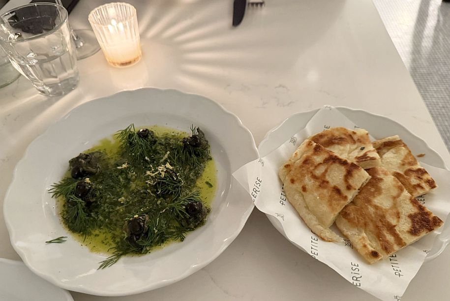 This dish is a creative, modern take on a French classic. The escargot was tender and buttery, but instead of the traditional parsley-garlic butter, the dill chermoula added a bright, herbaceous, slightly North African twist. The black garlic brought a deep, sweet umami richness.