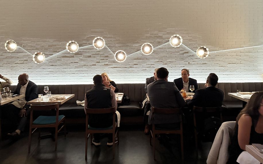 Beyond the bar, the dining area feels warm but modern. Clean-lined and contemporary rather than rustic, neutral colors and natural materials, soft lighting that becomes especially inviting in the evening, closely spaced tables that encourage a buzzing, communal energy. The overall effect is urban Italian elegance, refined yet relaxed.
