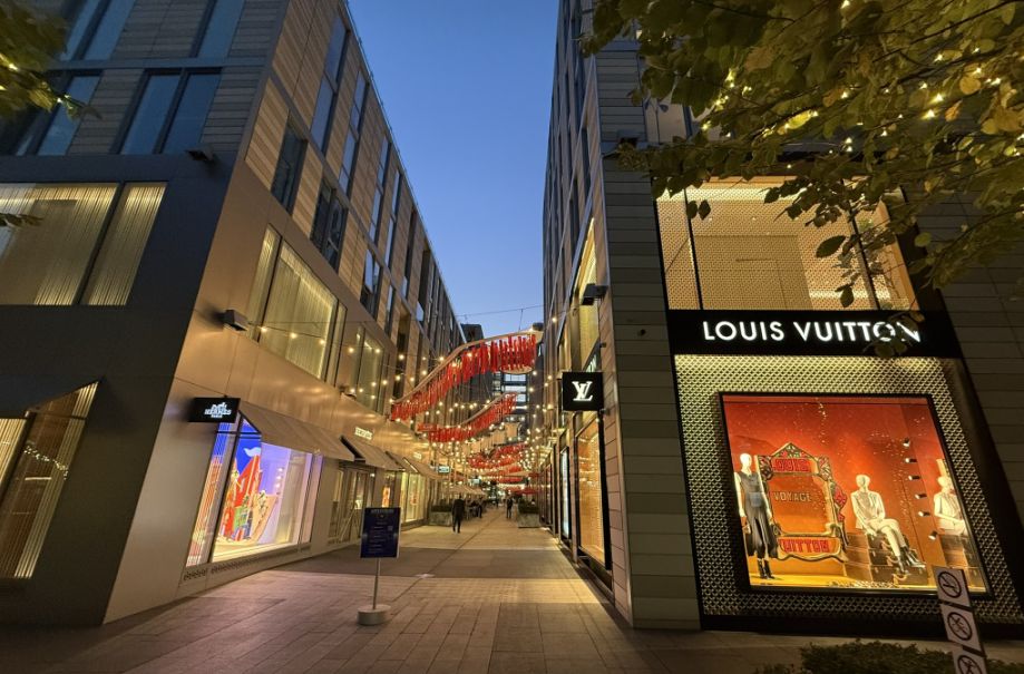 Designed as a luxury pedestrian district with wide walkways, modern architecture, public art, and outdoor seating.