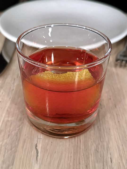 Hoa starting the meal with a Negroni. A Negroni is one of Italy’s most classic pre-dinner cocktails. Made with equal parts gin, Campari, and sweet vermouth, Bitter, herbal, slightly sweet, and citrusy, and designed to stimulate the appetite.