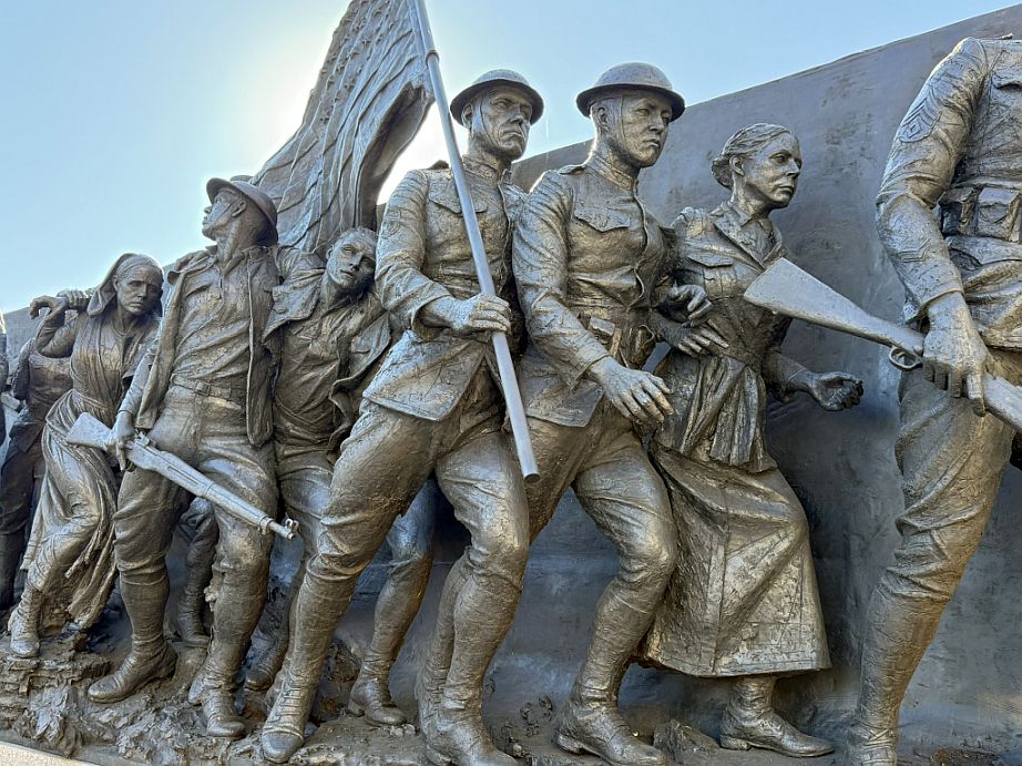 The sculpture emphasizes that World War I was fought largely by civilians suddenly drawn into global conflict.