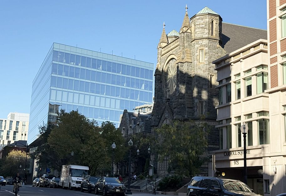 On the left is St. Patrick's is one of the oldest Catholic churches in Washington D.C., with roots tracing back to the early 19th century. The current building is in a Gothic Revival style, dates from later periods or renovations, but it retains a sense of solemnity and history. Churches of this era were built to last, often from stone, brick, or masonry, giving them a heavy, grounded, and permanent feel. In stark contrast to the church, the modern glass building next to it.