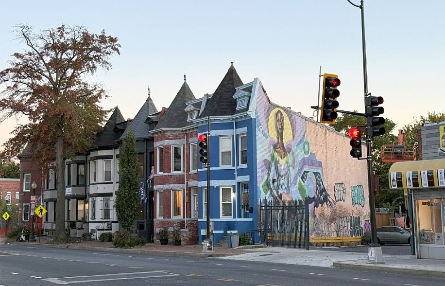 The use of bright colors contributes to a lively and distinctive neighborhood character, making these streets feel more intimate and less uniform than some of the grander, more monochromatic avenues elsewhere in D.C.