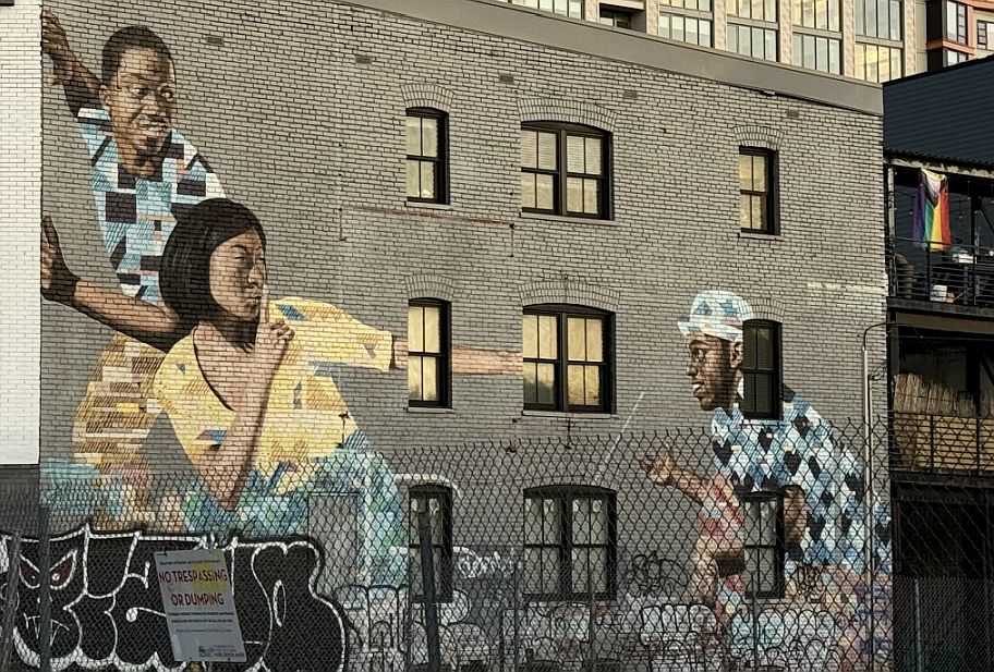 Another mural along the way. The "shushing" gesture strongly suggests a need for caution or secrecy. This could relate to sensitive community issues, historical struggles where discretion was paramount, or a shared understanding of a critical moment. The three figures, of slightly different ages, could represent different generations within the Black community. The "shush" could be a warning passed down; the watchful figure a reminder of past struggles, and the engaged boy a symbol of future action.