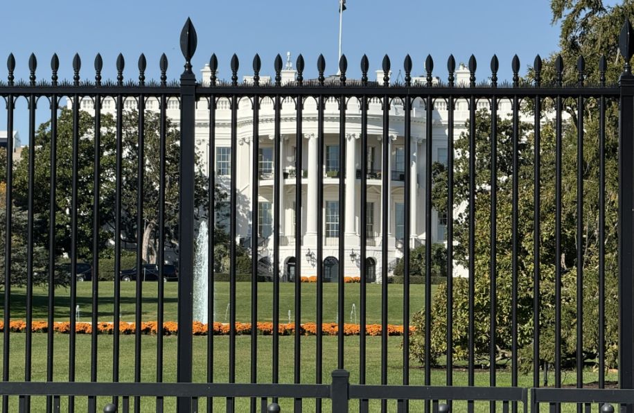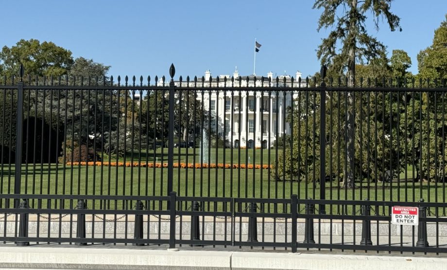 View of the front lawn through the metal fence. The North Lawn serves several purposes: it creates a ceremonial setting for the presidency, provides clear sightlines to the building (symbolic openness), and Acts as a security buffer zone.