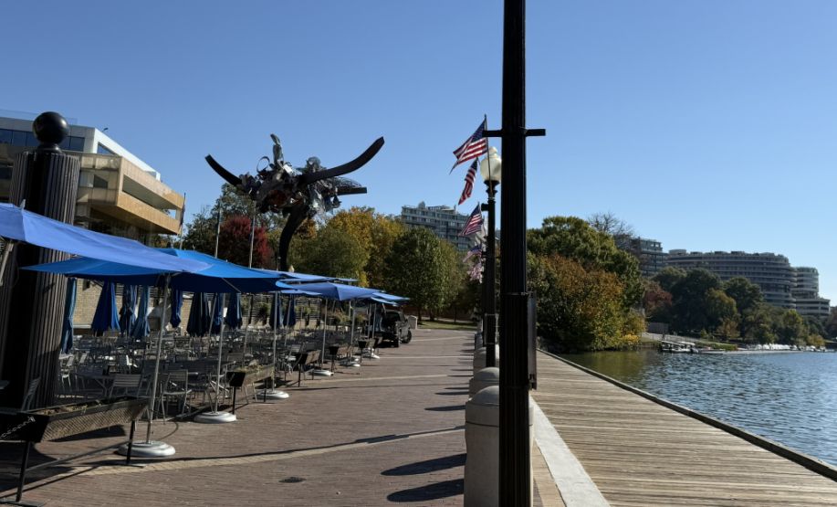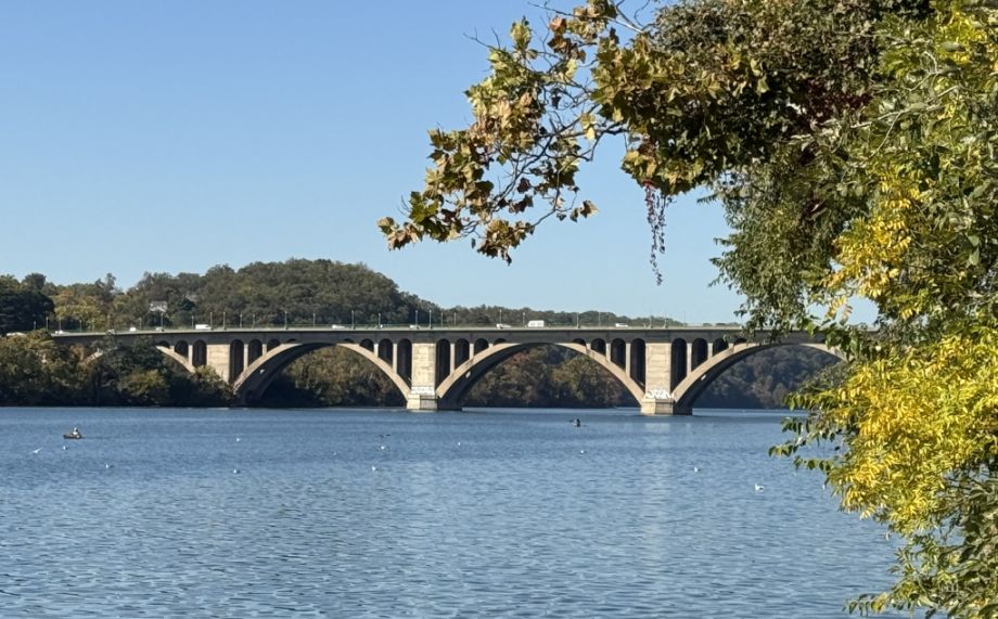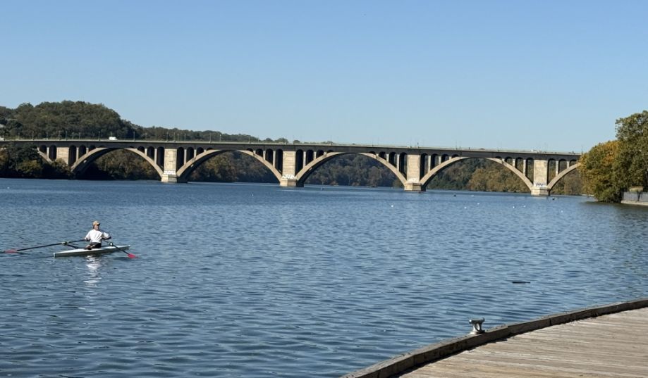 In the distance is the Francis Scott Key Bridge, built in 1923, its low stone arches stretch gracefully across the river, connecting Georgetown to Rosslyn, Virginia. From afar, the arches create a rhythmic pattern that frames boats moving underneath, one of the most picturesque views in the city.