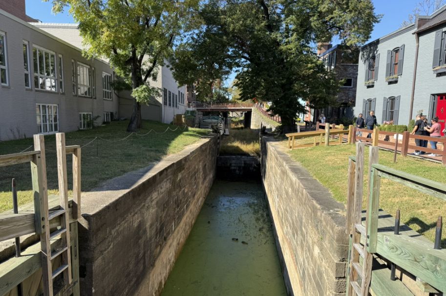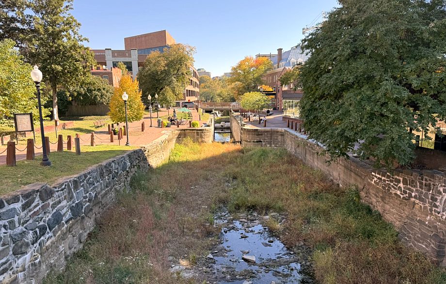 We are standing along one of Georgetown’s most historic features, the Chesapeake and Ohio Canal, usually called the C&O Canal, and what you’re seeing is a preserved piece of early American infrastructure from the 1800s.