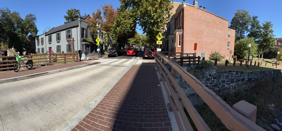 Raised stone walls (to the right of the street) are parts of the canal’s retaining walls and sometimes old lock or warehouse foundations. Their length shows just how extensive the canal system was, stretching 184.5 miles from Georgetown all the way to Cumberland, Maryland.