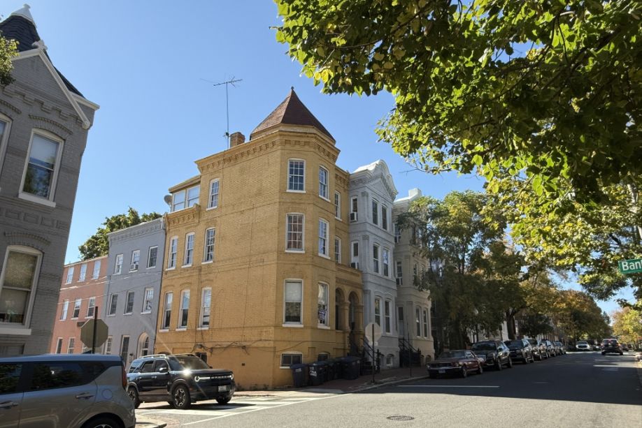 A row of Victorian rowhouse with pointed roofs. The 4-story colorful buildings are typically Victorian-era rowhouses, many built in the late 1800s when Georgetown was expanding and architectural tastes became more decorative and expressive.