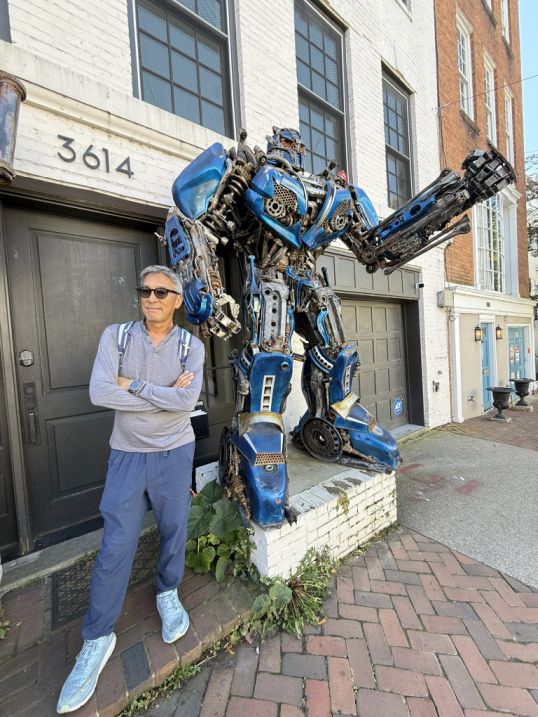 The building is known as the Georgetown Robot House, a private residence that became locally famous because of the large robot sculptures installed outside and on the roof. The colorful robots, two at street level and one perched above were created by the homeowner, an artist and designer who wanted to add a playful, futuristic contrast to Georgetown’s historic streetscape. Because this home sits inside the Georgetown Historic District, any exterior changes visible from the street must be approved by preservation authorities. Georgetown has strict rules intended to protect its 18th- and 19th-century character, materials, colors, additions, and even decorations can be regulated. City preservation officials have argued that the robots alter the historic appearance of the neighborhood, and rooftop installations are especially sensitive because they affect skyline views,