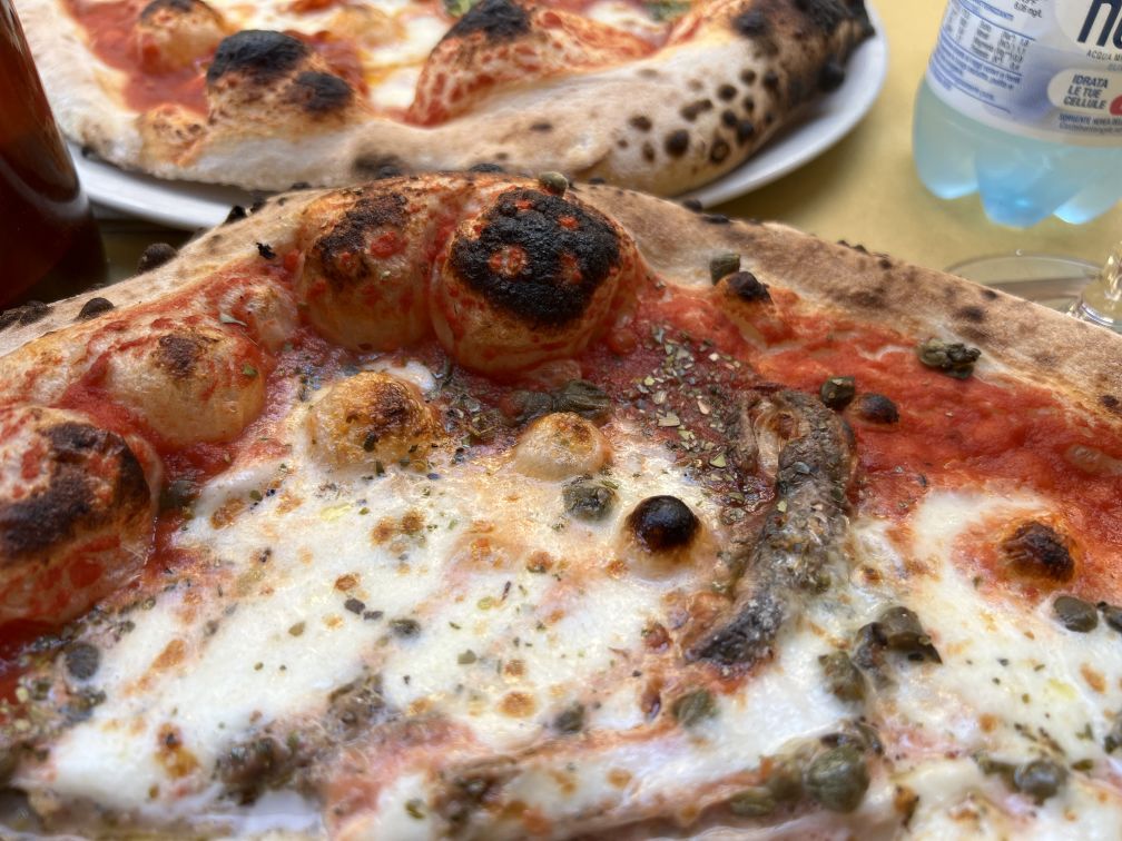 We got a Margherita (tomato, mozzarella, parmesan, basil) 6 Euros and a Napoli (Tomato, mozzarella, anchovies, oregano, cappers) -8 Euros
