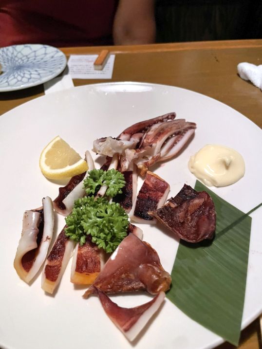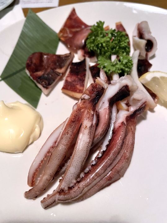 Grilled squid served with Kewpie mayonnaise and a squeeze of lemon is the "gold standard" in Japan. The creamy, slightly sweet mayo cuts through the smoky, charred flavor of the grilled squid perfectly.
