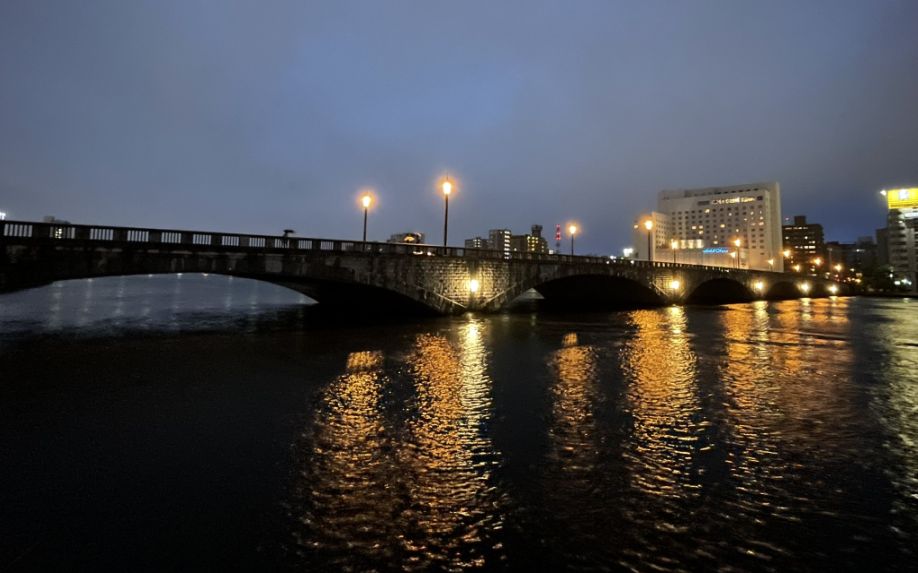 Ahead is the historic Bandai Bridge, a six-arched stone bridge that is a National Important Cultural Property. At night, its warm yellow lights reflect perfectly on the calm water of the Shinano.