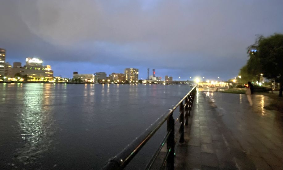 We are now walking along the Shinano River, a beautifully maintained riverside promenade that stretches along both banks of Japan's longest river.