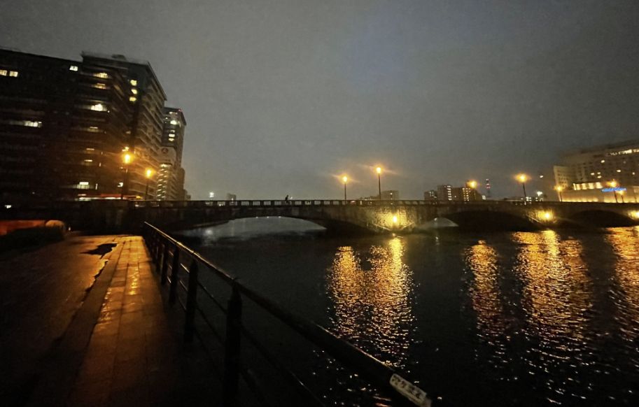 Riverside promenade at night.