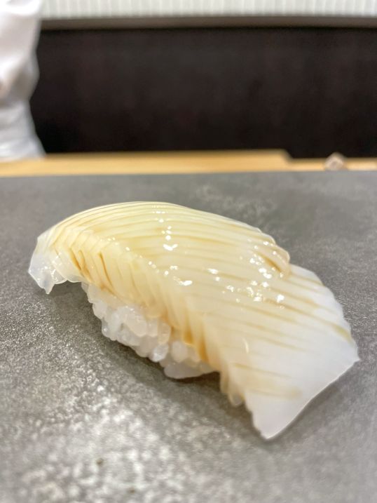 The second sushi is a squid finely scored, brushed with soy sauce. The squid was surprising tender yet lightly springy, never rubbery. The scoring made it silky to bite into, and the brushed soy sauce added a quiet saltiness that brought out its natural sweetness.
